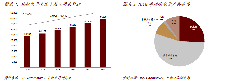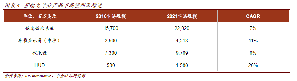全球市场空间。根据IHS Automotive 统计,2016 年全球座舱电子市场为287 亿美元,预计到2021 年将达到443 亿美元,CAGR 为9.1%。其中,车载信息娱乐系统占比较大,达到55%。仪表盘,车载显示屏(中控)和HUD 分别占到25%,9%和2%。