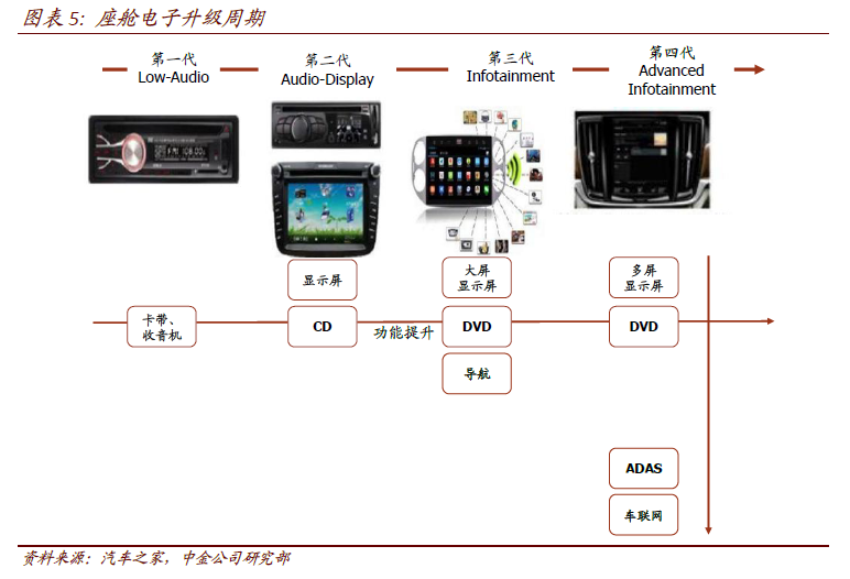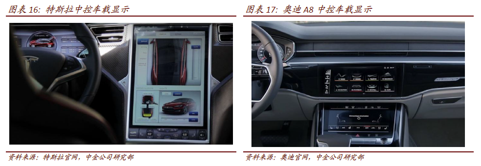 智能驾驶舱产品成为自动驾驶的入口。随着新能源汽车和自动驾驶汽车的普及,车用信息的交互需求逐渐提升。中控显示屏可以集成传统的车载信息娱乐功能和车载导航功能,并且能够实现更加丰富与便捷的人机交互,而传统的机械仪表盘已经无法满足新能源汽车的电量显示、续航里程等功能,而因此,以中控大屏和液晶仪表盘为代表的智能驾驶舱产品有望率先实现爆发式增长。