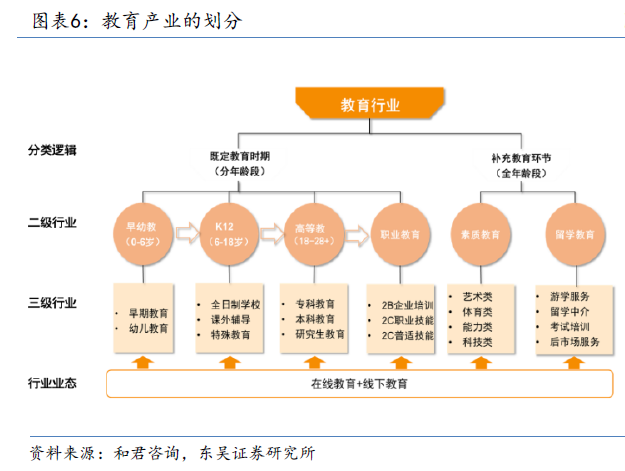 教育产业的划分。按年龄划分,可分为早幼教—K12教育(包括全日制学校、课外辅导、特殊教育等)—高等教育—职业教育等。不同阶段的民办教育市场差异非常大;同一阶段的不同赛道市场差异非常大,不同教育领域之间具有较高壁垒。