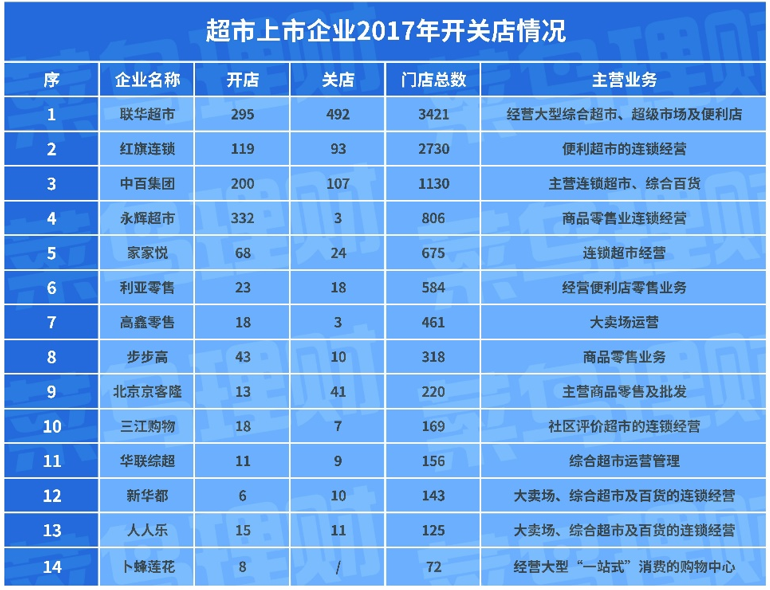 据《联商网》的统计,2017年,14家超市上市企业总共新开1169家店,较去年同期的1133家,同比增加3.18%;同时关闭828家店,较去年同期的721家,同比增加14.84%。
