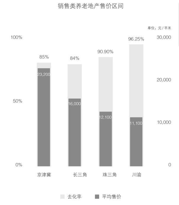 也发现很多项目做的非常的不错, 高端项目相比于中低端项目入住率普遍较高。比如京津冀集群的泰康之家、和熹会、上海亲和源、广州祈福护老公寓等入住率都是在 95% 以上。远洋的椿萱茂项目,据高力国际了解,从2014 年远洋椿萱茂亦庄项目到 2016 年的青塔项目,老年人对于入住养老公寓的接受度明显提高。整体优质销售类养老地产项目去化率普遍较高,平均在 80% 以上 , 其中去化率最高的是川渝区域,其次是珠三角区域。因为川渝区域和珠三角区域以高端旅游养老地产居多,这些高端地产去化率基本都非常高,也使得川渝区域养老房产去化率很高。