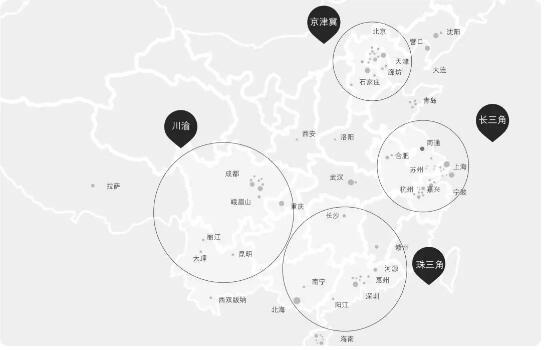 通过对近40家国内领先的养老地产开发商的全国近 150个项目的调研,绘制了优质养老地产项目的全国布局图。通过分析,我们可以看到目前我国养老地产主要分布在四个区域:京津冀经济圈、长三角经济圈、珠三角经济圈、川渝经济圈,形成 4个重要的养老地产集群,其他风景优美的宜老城市也有少量分布。
