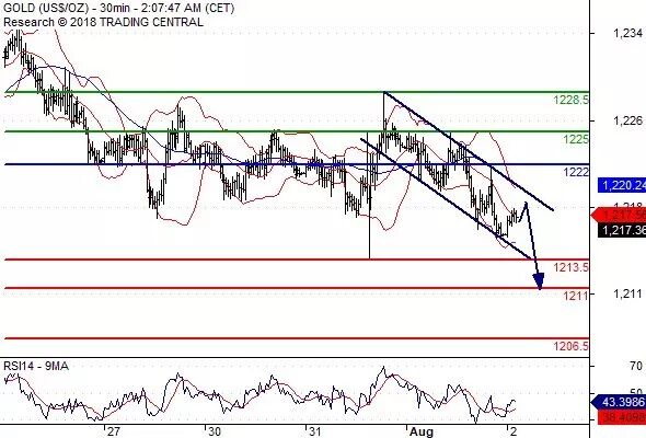 交易策略: 在 1222.00 之下,看跌,目标价位为 1213.50 ,然后为 1211.00 。