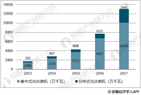 2017年中国的光伏发电装机实现快速增长,分布式光伏实现爆发式增长。2017年,全国光伏装机5306万千瓦,同比增长54%,占全部新增电力装机的40%。其中,集中式光伏装机增速减缓,同比增长11%,分布式光伏爆发式增长,新增装机达到1944万千瓦,同比增长3.7倍。