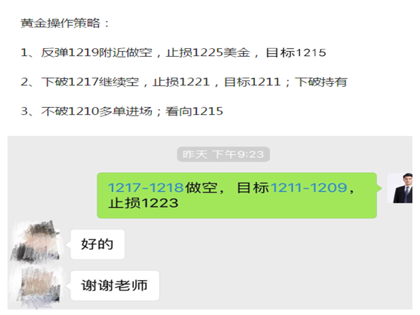 周四:早间1218.5做多抢个反弹,在1221赚个早餐钱,行情也很配合,然后1220附近做空,目标看1215-12,晚间也顺利达到了15一线,没单的也通知1215-16可继续介入空单,看新低。晚间直接给到了预计点位1208-06.满载而归。