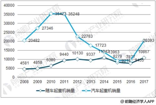 前瞻产业研究院数据显示,2016/2017年我国汽车起重机销量分别为0.79/1.09万台,根据预测,2018-2022年中国随车起重机销量分别为1.09/1.31/1.53/1.75/1.98万台,4年GAGR16.09%。