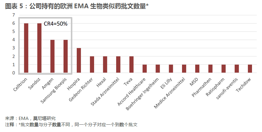 生物类似药批文数量集中于少数几家公司。欧洲EMA批准的一共40个生物类似药批文归属于18家公司,其中拥有批文最多的前四家公司覆盖了20个批文,占比50%,批文集中度较高。虽然在这18家公司中不乏Sandoz、Teva这样的传统仿制药企业,但是在领先公司中,Celltrion、Samsung Bioepis这样成立时间不久,专门进行生物类似物研发的公司的表现格外抢眼。