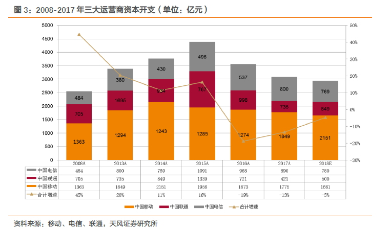 流量高增长趋势,光通信产业受益。根据电信韦乐平专家统计,2006-2016年中国电信骨干网实际流量年复合增速为47%,同时预计2015-2020年复合增速仍高达42%,另外,城域网中很多流量只需在访问本地服务器,无需经过骨干网,韦乐平判断中国电信城域网流量增速将是骨干网的1.5-2倍。从工信部披露的数据来看,中国的移动互联网流量过去5年呈持续高增长,17年增速高达199%,随着网络接入节点数量增多以及单个节点的带宽需求增大,预计未来中国移动互联网流量仍将保持这种高速增长态势。