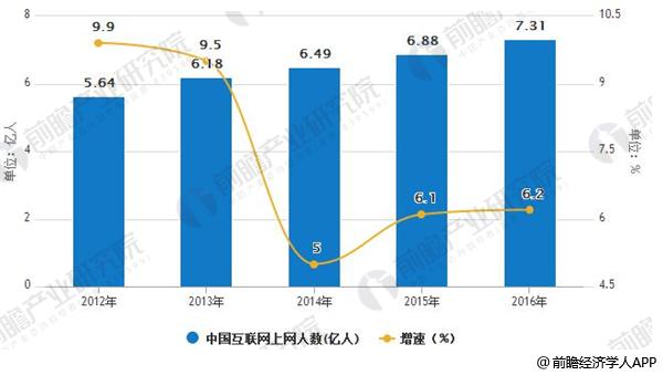 2012-2016年中国互联网上网人数及增长情况