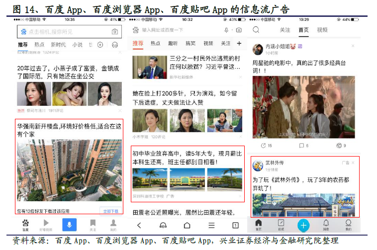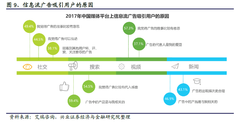 广告主预算从搜索端转移到信息流端,信息流广告距天花板仍远。据第三方统计机构数据,2017 年中国整体广告市场规模约为6500 亿,整体增速在个位数水平;而中国网络广告市场依旧保持25%以上的高速增长,预计2017 年整体规模近4000 亿元,后期随市场不断成熟,线下向线上迁移变缓,增速将趋于平缓,未来几年增速预计在20%-30%之间。
