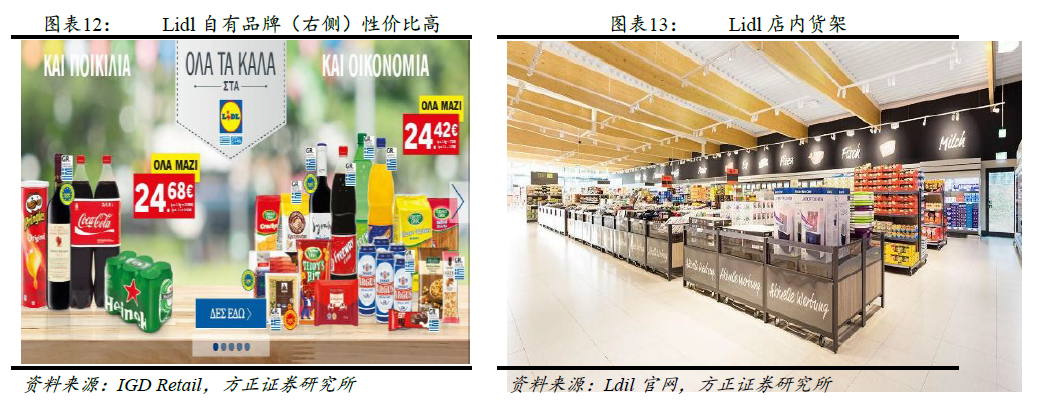 在零售企业实现全国垄断后,且网点比较密集的时候,发展自有品牌就水到渠成了。在欧洲大多数国家的超市中,自有品牌的商品占比都会达到30%以上,英国前三大零售商Tesco\Sainsbury\Asda 自有品牌销售额占比分别为50%、20%、50%,德国前三大零售商Lidl \Aldi、Metro 自有品牌销售占比分别为75%、93%、30%。物美价廉、各具特色的自有商品,成为欧洲零售行业的标志性特色。