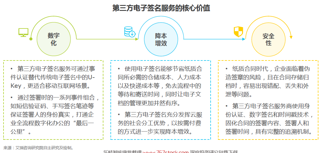 以降本增效的方式打通企业数字化办公最后一环。当前,我国企业 信息化推进步入深水区无论互联网还是 传统企业都基本实现了数字化办公。然而多进行合同 签署时,依然需要由线上转为下已成企业现阶段打通全流程数字化办公 的掣肘之一 。第三方电子签名服务能够为 企业解放大量的人力物,无需再组建专团队来负责纸质合同签署流程和管理工作从而幅降低运营成本提高工作效率。尽管大众对电子签名安全性的认知尚浅,但实际上采用严格的认证和加密手段第三方电子签名服务比传 统纸质合同 +签字盖章的方式具有更高安全性。