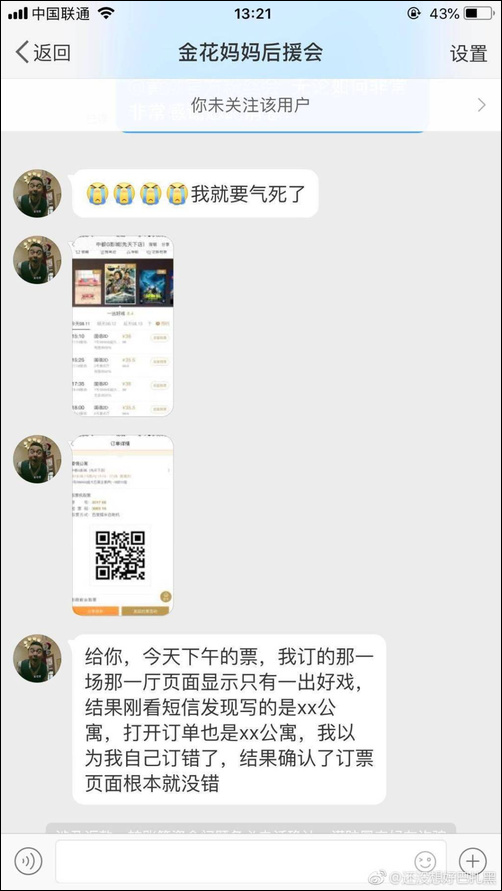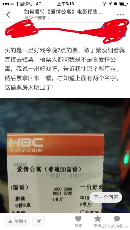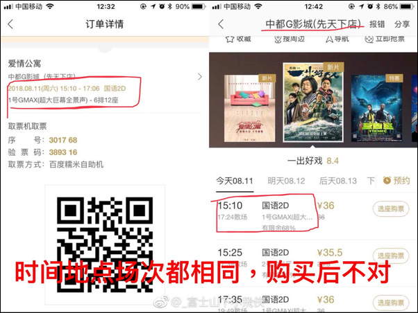 而在该微博的1万余条评论里,不少网友贴出了证据,指责自己买的《一出好戏》电影票最终被换成了《爱情公寓》,对此表示非常愤慨。