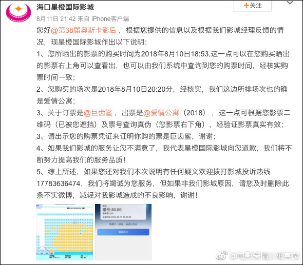 官微晒出了海口星橙国际影城关于上述网友爆料“《巨齿鲨》被偷票房”的反馈,但关于更多关于《一出好戏》的爆料,并未回应。