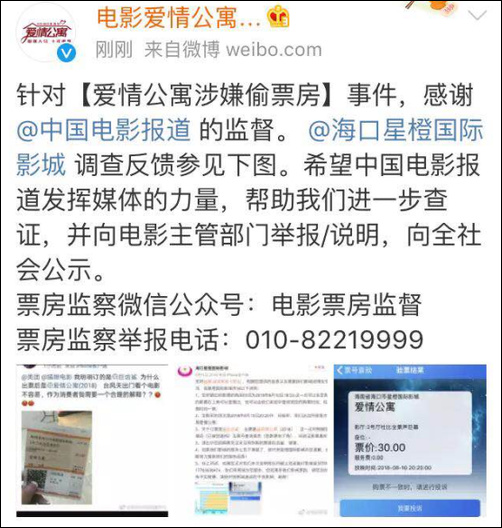 @中国电影报道 12日发布微博征集偷票房的证据,并称将对此事进行调查。微博的配图是两张《爱情公寓》的电影票,但电影名字被人工划掉改成了《一出好戏》。