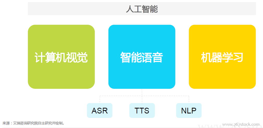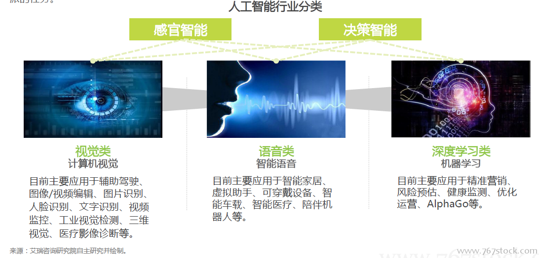 虚拟语音助手是人工智能的重要应用领域。计算机视觉、智能语音和机器学习是人工智能的三大核心基础技术,目前研发出的人工智能应用大多是这三种技术综合运用的结果,只是其中的主次之分不同。依据核心基础技术类目,可以将人工智能分为两大类,即感官智能和决策智能,其中视觉智能、语音智能和深度学习智能是感官智能和决策智能下的三大子赛道。目前,语音智能的一个重要行业应用就是虚拟助手,即“智能语音助手”。它的核心在于人类通过纯语音信息实现与机器的交互,让智能机器“助手”帮忙完成指派的任务。