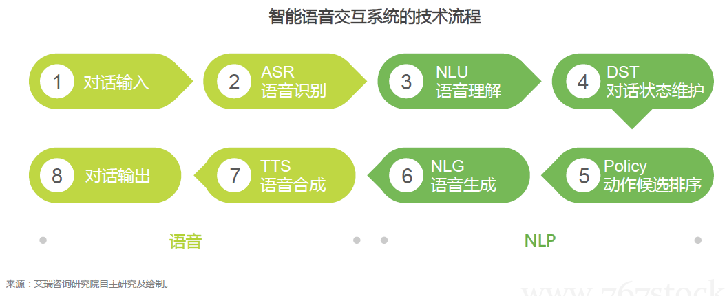 语音识别、声纹识别、语音合成等。人类因为具有语言的能力而区别于其他物种,智能语音技术即研究人与计算机直接以自然语言的方式进行有效的沟通的各种理论和方法,涉及机器翻译、阅读理解、对话问答等,因为语言在词法、句法、语义等不同层面的不确定性及数据资源的有限性、背景知识的复杂性等各方面限制,智能语音技术仍有非常大的提升空间,仅在特定领域可取得较好的应用,鲁棒性存在大量挑战。在自然语言处理之前,声纹识别可根据说话人的声纹特征识别出说话人,语音识别技术可赋予机器感知能力(在深度学习的驱动下,目前近场语音识别准确率可达98%,远场、抗噪、多人等非限定或配合条件下的识别有待改进),将声音转为文字供机器处理,在机器生成语言之后,语音合成技术可将语言转化为声音,形成完整的自然人机语音交互,这样的语音交互系统可看作一个虚拟对话机器人,具体流程如下。