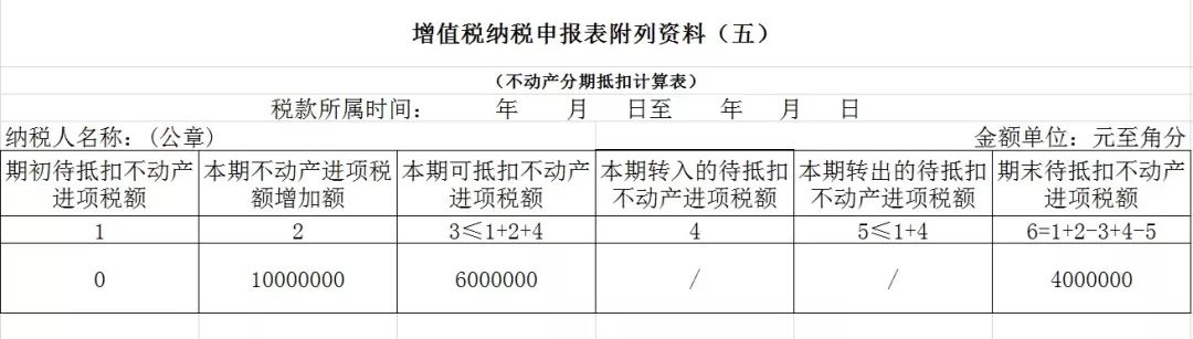 将不动产进项税额全额1000万元,填入《增值税纳税申报表(一般纳税人适用)》附列资料(五)“本期不动产进项税额增加额”栏次。