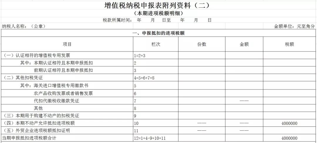 该400万元应于2018年4月申报期申报3月所属期增值税时,填入《增值税纳税申报表(一般纳税人适用)》附列资料(二)“本期不动产允许抵扣进项税额”栏次,所填税额作为增加项填入“当期申报抵扣进项税额合计”栏次,并填入主表中“税额”栏次。