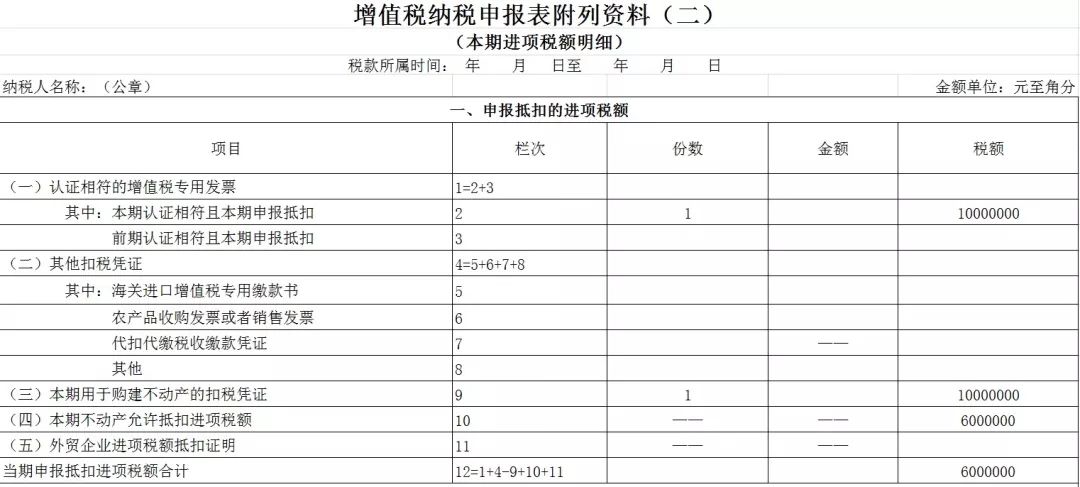 本期《增值税纳税申报表(一般纳税人适用)》附列资料(二)“本期不动产允许抵扣进项税额”栏次,所填税额作为增加项填入“当期申报抵扣进项税额合计”栏次,并填入主表中“税额”栏次。