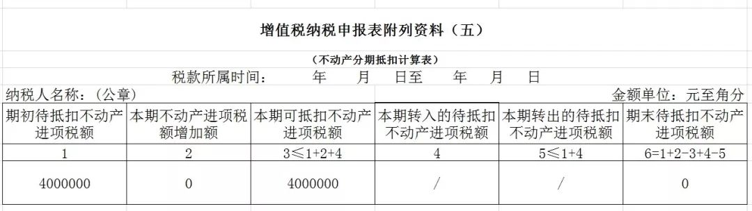 该400万元应于2018年4月申报期申报3月所属期增值税时,填入《增值税纳税申报表(一般纳税人适用)》附列资料(五)“本期可抵扣不动产进项税额”栏次。