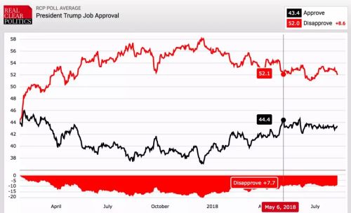 随着事情的发酵,2018年5月6日,特朗普美国国内支持率有升到11个月以来的最高44.6%。