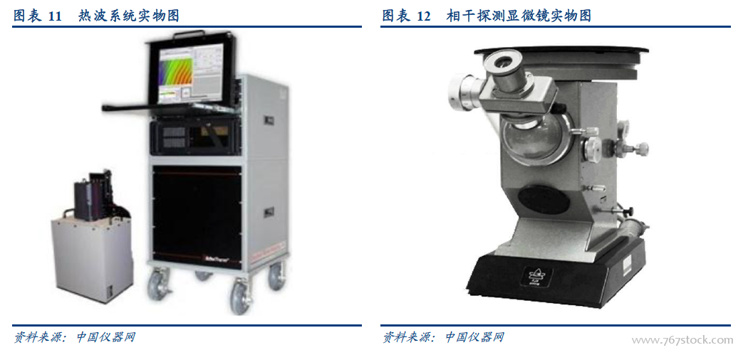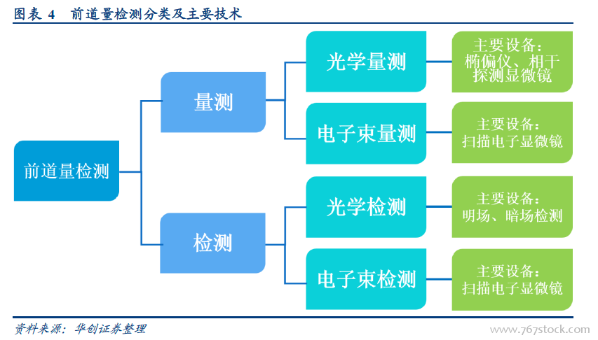 前、后道检测设备的研发具有很高的技术和资金壁垒,该市场同光刻、刻蚀一样,也呈现出国外巨头高度垄断的状况。前道量检测设备的下游客户是晶圆代工厂,在该领域内科磊以52%的市场份额稳坐第一把交椅,其薄膜厚度测量、缺陷检测产品具有较高的市占率。后道检测设备下游客户是IC封测企业,其中东京精密在探针台细分市场份额高达60%,泰瑞达与爱德万在检测台市场共拥有超过90%的市占率,而爱德万、科休和爱普生的分选机产品拥有超过60%的市场份额。目前,检测设备已经可以与光刻、刻蚀等设备的精度保持同步发展,该工艺的设备精度也逐渐成为制约集成电路产业发展的瓶颈之一。