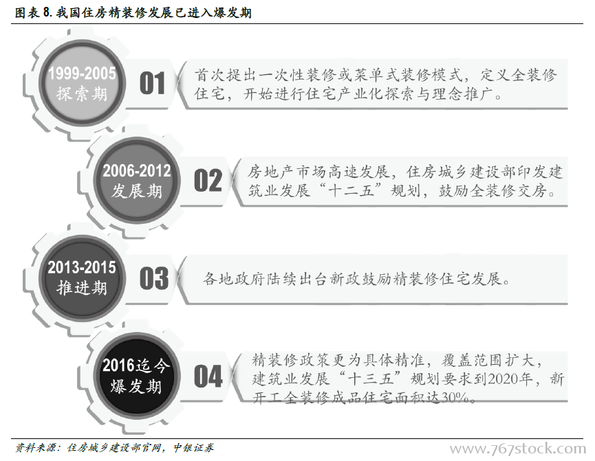 政策助推我国进入精装住宅建设爆发期。相较欧美日等发达国家,我国精装修住宅起步较晚,直至1999 年才首次推出一次性装修或菜单式装修模式,提出要通过普及全装修,减少资源浪费与环境污染;2006 年起,随着房地产市场爆发,全国性地产开发商高速成长,建筑业发展“十二五”规划推出,精装房开始步入发展期;2013 年起,各地政府先后出台精装修推广政策,加速精装修住宅建设落地;2016 年起,更多省市及地方政府相继推出范围精准、目标明确的精装修政策,建筑业发展“十三五”规划更是明确提出到2020 年,我国新开工全装修成品住宅面积要达30%,一举将我国精装修建设推入爆发期,各地区精装修普及率加速提升。
