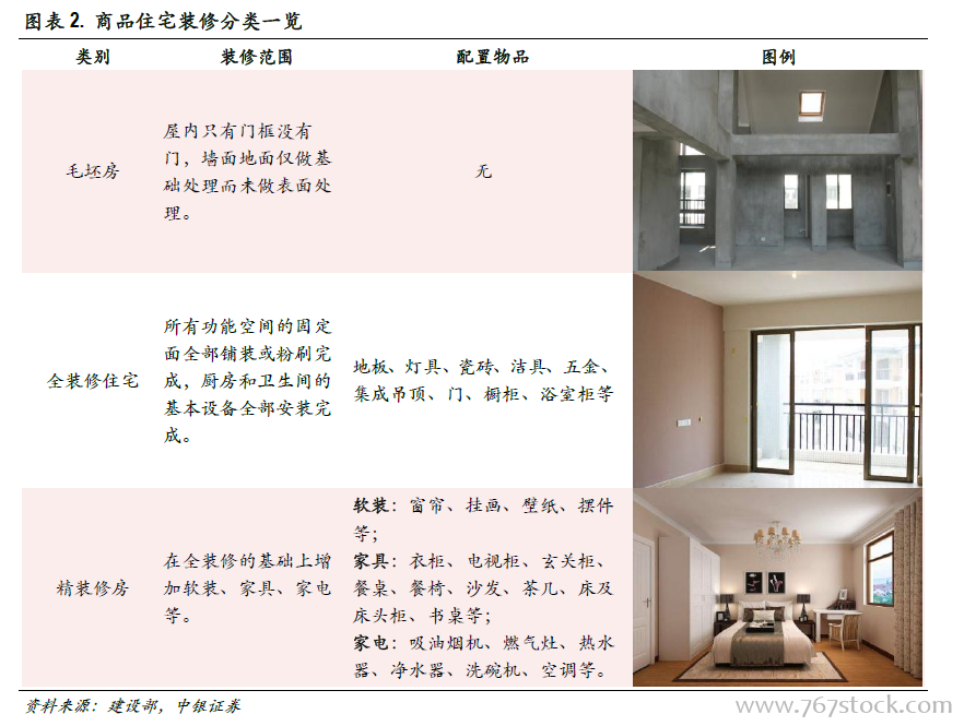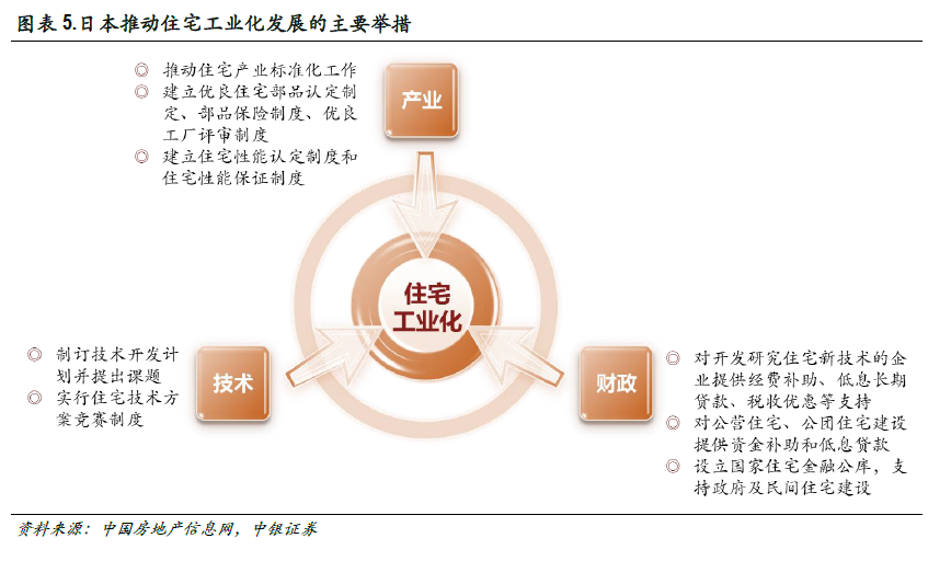他山之石:从日本看住宅精装修普及动因。精装修模式起源于上世纪六十年代的瑞典,随后欧美日等发达国家纷纷跟进。由于各国人文与生活习俗不同,发展至今,特征各异。在美国,精装住宅以公寓为主,装修部品部件已实现“标准化、系列化、通用化”,业主可通过产品目录购买所需部品部件,进行DIY 装修,整个装修过程业主的参与度很高。在以德国、法国为代表的欧洲,业主通常不太注重厨卫以外空间的硬装,追求精美而有个性化的软装,喜欢通过摆件、窗帘、桌布、餐具等装饰赋予住宅个性化的美感。在日本,当时住房紧缺的局面形成了住宅一体化流水线式生产模式,地面、墙面、浴缸、马桶、橱柜等皆由完整部件组合而成,住宅建设与装修实现了工厂化、标准化、装配化生产与组装,效率大幅提升。
