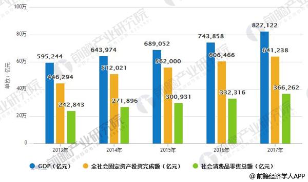 2013-2017年我国GDP、全社会固定资产投资完成额和社会消费品零售总额的具体情况