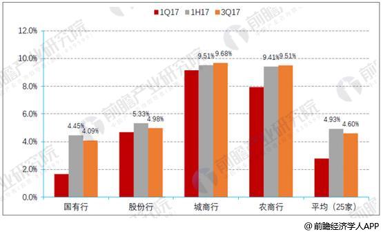 净利增速平稳略降。据前瞻产业研究院发布的《银行业市场前瞻与投资战略规划分析报告》数据显示,前三季度上市行净利润同比增4.6%,较中期的4.9%略有下降。各类行来看,大行净利润同比增4.1%,较中期下降0.4 个百分点,主要是中行净利润同比下降较多;中小行中,股份行净利润下降较多,城商行与农商行净利增速较中期的高位水平仍有提升。