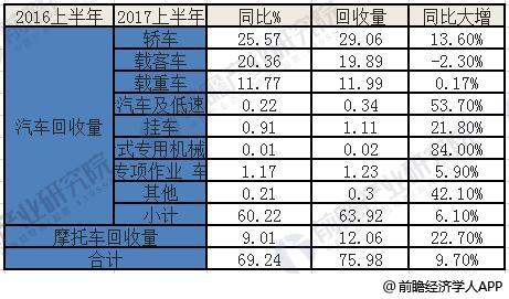 据前瞻产业研究院发布的《报废汽车回收行业市场前瞻与投资战略规划分析报告》数据显示,2017年上半年,我国报废机动车回收拆解量较上年度同期有所上升。2017年1-6月份,全国回收报废机动车共计75.98万辆,与2016年上半年的69.24万辆相比,同比增长9.7%。