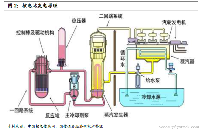 核电站通过核能→热能→机械能→电能的能量转换路径实现发电。核能发电基本原理是核裂变产生能量加热水生成蒸汽,将核能转变成热能;蒸汽压力推动汽轮机旋转,热能转变为机械能;然后汽轮机带动发电机旋转发电,将机械能转变成电能。以当前的主流压水堆核电站为例,其能量转换借助于三个回路来实现。在一回路中,反应堆冷却剂(通常为水)在主泵的驱动下进入反应堆,流经堆芯后带走核燃料裂变产能的能量,进入蒸汽发生器将热量传递给二回路的水,然后再流回到主泵,循环往复;在二回路中,二回路水通过热交换被一回路的水加热生成蒸汽,蒸汽再去驱动汽轮机,带动与汽轮机同轴的发电机发电,做功后的剩余蒸汽再经三回路冷却为液态水后,再次进入蒸汽发生器循环;在三回路中,三回路冷却水通过凝汽器冷却二回路做功后的蒸汽,带走剩余的弃热。