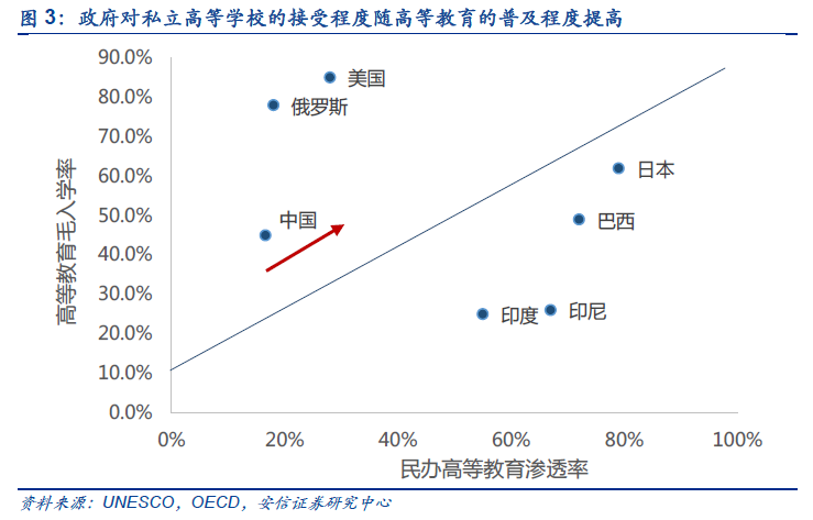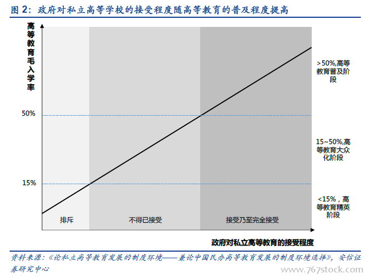 政府对私立高等学校的接受程度随高等教育的普及程度提高。根据陈武元《论私立高等教育发展的制度环境——兼论中国民办高等教育发展的制度环境选择》,国际经验表明,在国家主导型的高等教育系统中发展私立高等教育,政府都会有从“排斥”到“不得已接受”再到“接受乃至完全接受”的过程。一般来说,“排斥”主要表现在精英教育阶段,“不得已接受”主要表现在大众化起步阶段,“接受乃至完全接受”主要表现在后大众化阶段或普及化阶段。