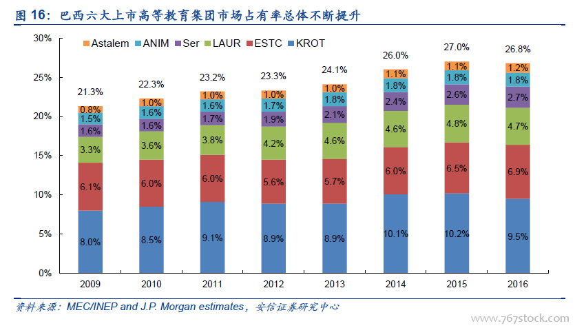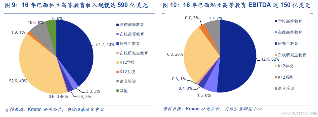 印、巴、中、美为全球前四大民办教育市场。以在校生计算的民办高等教育规模排名靠前的有印度、巴西、中国、美国、印尼、日本、韩国、英国等国家。2017 年印度、巴西、中国和美国高等教育在校生人数分别达1620 万、600万、590 万、和550 万左右。其中,巴西与美国民办高校发展历史较长、规模较大,我们以两国为例剖析民办高校行业发展脉络。