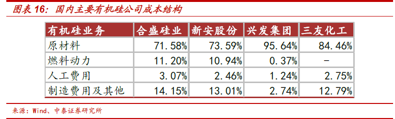 第三阶段:需求高增,叠加供给钝化,最强盈利时期已至。经历了近5年的产能消化,随着2016 年开始下游需求大幅增长,而供给端处于产能周期底部且开工率已至高位,加之上游原料成本价格上涨稳步推动DMC 价格上涨至今天34500 元/吨的价格高位,并且价格顺利传导至下游有机硅产品,全产业链价格集体处于上涨趋势。