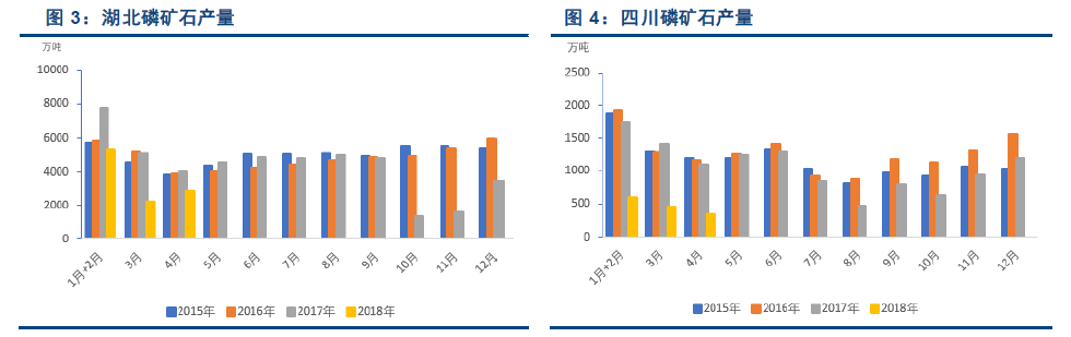17 年磷矿石产量首次下降,预计未来持续收紧。我国近20 年来磷矿石产量保持较高的增长速度,05~15 年均增长率约为17%,年总产量增至1.4 亿吨。16 年的环保督查开始对磷矿石产生重大影响,云南作为环保督查第一批进驻省份,磷矿石全年减产500 万吨;四川德阳建立大熊猫生态圈,地区全面限产, 涉及减产产能达400 多万吨;湖北宜昌计划关停15 万吨/年以下的磷矿山,50 万吨以下的矿将到期不再续。17 年更加严峻的环保形势,导致全国磷矿石产量降至1.2 亿吨,同比减少15%。