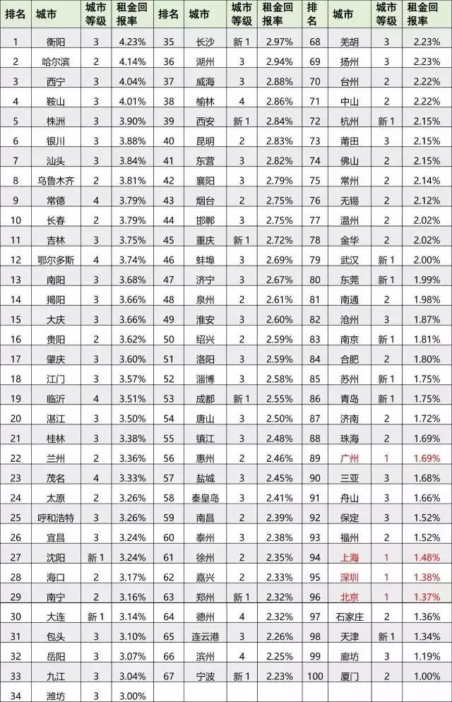 根据智谷趋势数据服务公司采集、整理的国内100座城市2017租金回报率数据,中国城市租金回报率与国外相比普遍较低。原因主要有两点:一是房价较高,二是租金水平比国外低。