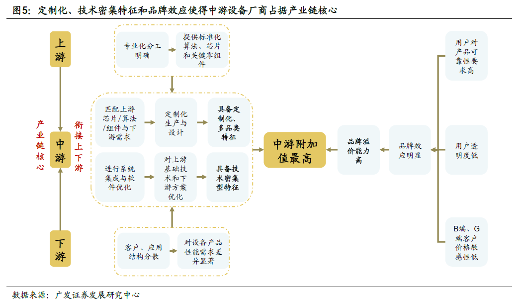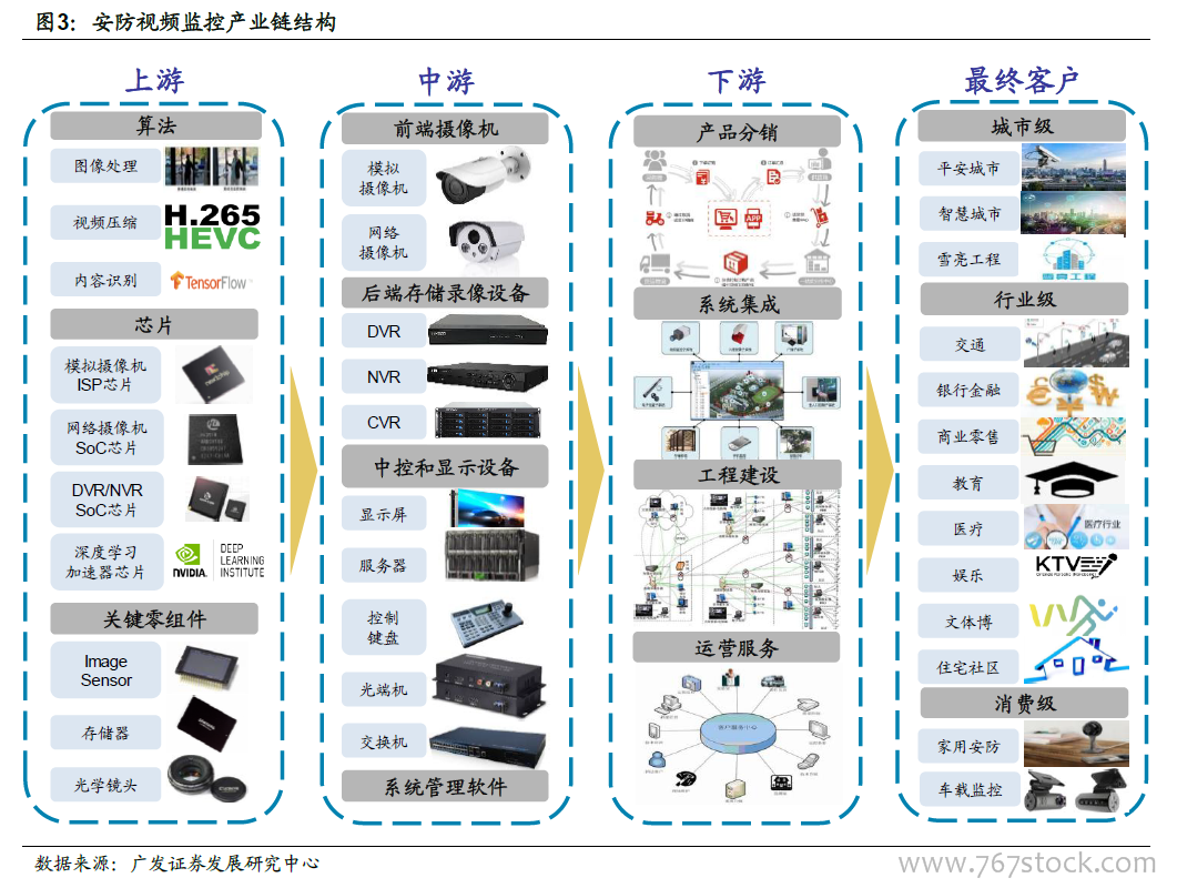 产业链的下游包括产品分销、系统集成、工程建设和运营服务四大环节,这些下游环节的主要参与者为小规模的地方型企业,市场格局较为分散。另外,海康威视和大华股份等龙头设备厂商在部分规模较大的项目中也承担了系统集成和运营的角色。