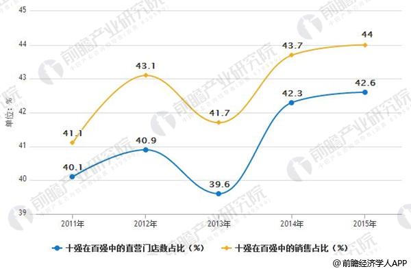 2015年前十连锁药店在百强连锁中的集中度为42.6%