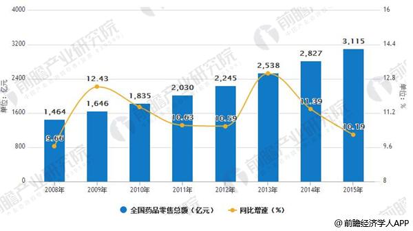 据前瞻产业研究院发布的《连锁药店行业市场前瞻与投资战略规划分析报告》数据显示,2015年中国药店零售总额为3115亿元,同比增速10.19%;2015年全国卫生总费用总额为38775.37亿元,同比增速为9.81%;2015年全国GDP为676708亿元,同比增速为6.90%;2015年全国人均卫生费用2820.81亿元;同比增速9.26%。
