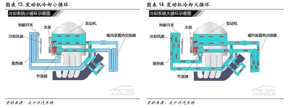 在发动机冷却领域,插混热管理系统或将更加复杂。新能源汽车分为纯电动汽车和插电混动汽车(含增程式),其中纯电动汽车不需要发动机冷却系统,而插电混动汽车(含增程式)发动机冷却系统和原有燃油车差别不大,部分与电池热管理系统集成,系统结构会更加复杂,零部件数量更多,热管理单车价值量也将上升。