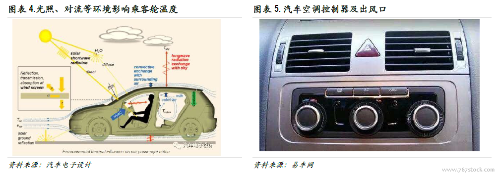空调系统构成及原理。汽车空调一般主要由压缩机、冷凝器、蒸发器、膨胀阀、贮液干燥器、管路、风道、空调箱总成、控制系统等组成,主要功能包括制冷和制热。