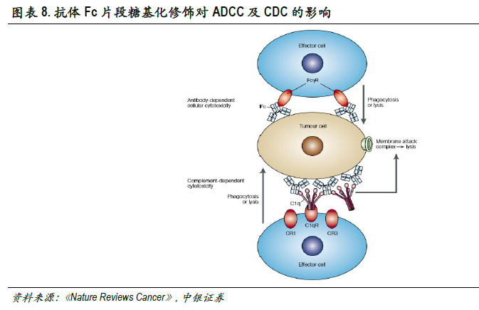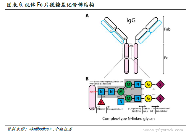 单抗Fc片段糖基化修饰显著强化单抗药物细胞毒作用。Fc片段通过活性区域与受体相结合发挥效应子功能。人类具有多种效应子配体(如FcyRs、C1q补体等),IgG的N-糖基化位于Fc片段的CH2区的共有序列(Asn297-X-Ser/Thr,X可以是除脯氨酸的任意氨基酸残基),通过酰胺键与抗体共价结合。Fc糖基化糖分子具有复杂的双天线型核心结构,该结构由甘露糖(Man)和N-乙酰葡糖胺(GlcNAc)两种戊糖分子组成,不同糖型除核心结构外还含有不同数目的糖分子,如岩藻糖(Fuc)、甘露糖、N-乙酰葡糖胺、半乳糖(Gal)、二等分N-乙酰葡糖胺和唾液酸(Sia)。