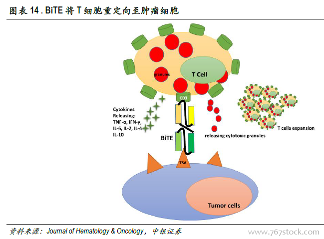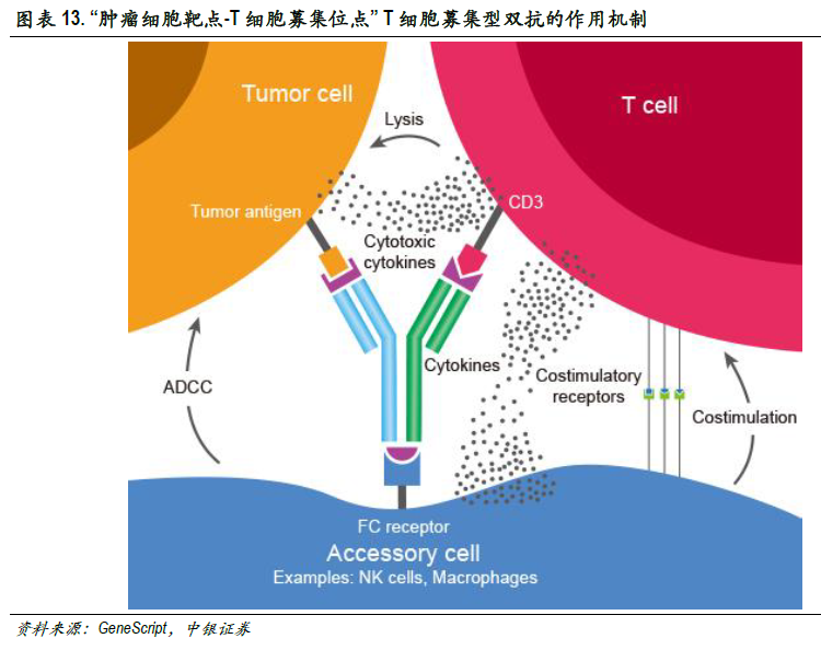双特异性抗体具有“1+1>2”的肿瘤治疗效果。从靶点来源角度,双特异性抗体可以分为两种,即T细胞募集型和肿瘤双靶点结合型。肿瘤双靶点结合型可同时结合肿瘤细胞的两个靶点(如VEGF-PDGF、VEGF-Ang2),单克隆抗体通常只靶向一个抗原或一个表位,而某些疾病的发生常常与多条信号通路相关,导致疾病的复发,双抗可以抑制2条信号通路减少产生耐药的可能性。T细胞募集型双抗靶向肿瘤细胞靶点和T细胞募集位点,占双抗的大部分,T细胞募集位点一般靶向CD3(T细胞)、CD16靶点(NK细胞),可将T细胞重定向到肿瘤细胞,避免肿瘤细胞的免疫逃逸。