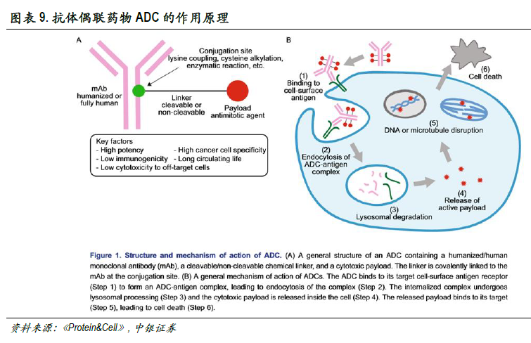 抗体偶联药物(ADC)可降低化药毒性,但制备技术仍是需要攻克的难点。抗体偶联药物(ADC),是一种将化学类药物通过连接物(linker)与抗体偶联形成的药物,进而降低化疗中常用药物非特异性的全身毒性。抗体偶联药物经过血液运输到达并识别癌细胞的表面抗原,其抗体部分与抗原结合后被内吞进入癌细胞内部并进一步在溶酶体中被剪切,释放有杀伤作用的化合物类药物(作用于DNA或细胞微管蛋白)。内吞化学类药物的细胞死亡裂解后,毒素分子会释放至附近的其他肿瘤细胞进一步发挥杀伤作用。