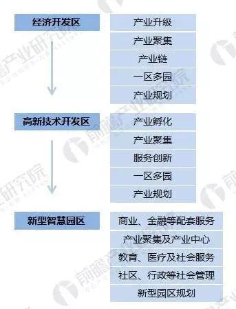 从时间维度来看,我国园区正在从传统的工业园区向新区过度,在形式上有从低级向高级,由单一向综合园区发展的趋势。尤其是经开区和高新区通过产业结构升级和服务内容升级,打造多产业聚集和社会服务职能,并逐步向新区方向发展。在新区阶段,商业、金融等配套服务进入园中,产业中心逐渐形成,社会服务和社会管理开始全面布局。