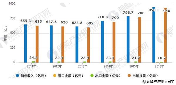 2016年我国运动鞋行业销售收入约950.1亿元,进口金额8.7亿元,出口金额18.8亿元,国内市场规模约940亿元。