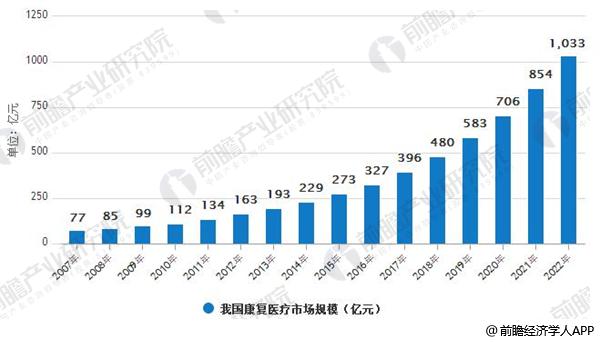 据前瞻产业研究院发布的《康复医疗行业发展前景与投资预测分析报告》数据显示,当前康复医学的发展仅仅满足了我国康复的小部分需求,仍有大量康复需求人群未被满足。预计2022 年中国康复市场将达到1000亿。