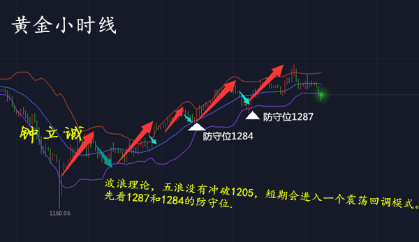 但是周三的日线收线对多头比较不利,周三收线是一个连阳之后的高位十字星,并且是在千二一线受到了强力的压制,所以今天日线级别来看,黄金出现回调的几率极大,小时线小五浪并未突破1205,走回调路线。
